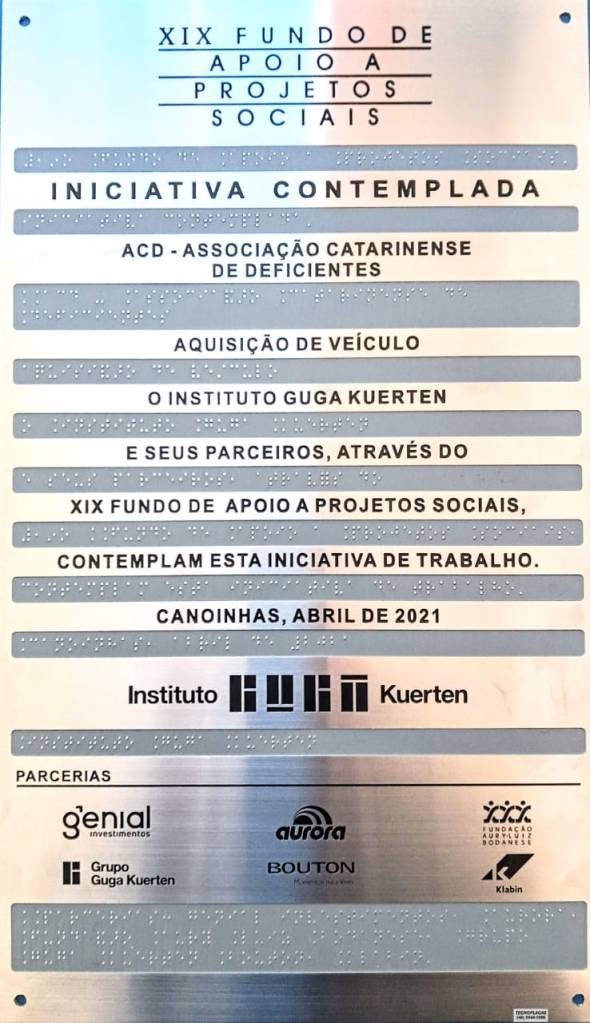No dia 18 de maio de 2021 a Associação Catarinense de Deficientes recebeu a entrega oficial do veículo Kwid através de um projeto contemplado pelo XIX FAPS – Fundo de Apoio a Projetos Sociais, programa organizado pelo Instituto Guga Kuerten. A solenidade ocorreu nas imediações da Apae de Canoinhas, instituição que também teve projeto contemplado. Na ocasião estavam presentes Alice Thummel Kuerten, Diretora do instituto e Silvana Silveira Medeiros, Superintendente Executiva. O presidente Sandro Teleginski e a Assistente Social Mirian T. Melo foram os representantes da ACD.